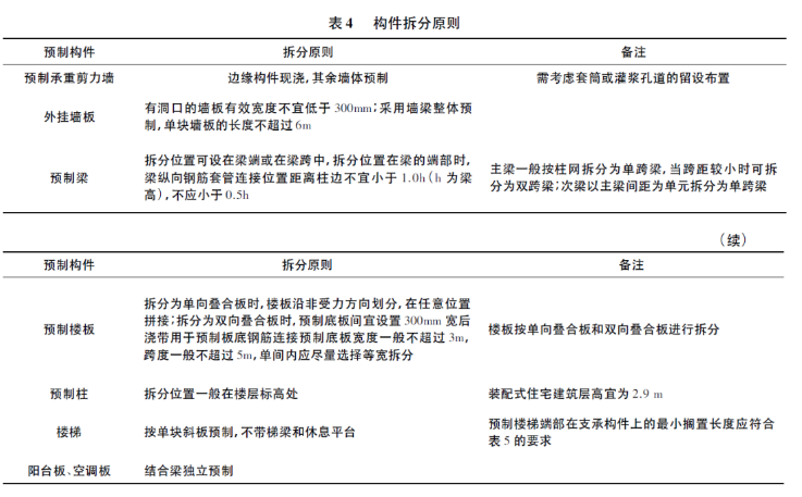 裝配式建筑構(gòu)件拆分是設(shè)計(jì)的關(guān)鍵環(huán)節(jié),根據(jù)《預(yù)制預(yù)應(yīng)力混凝土裝配式整體式框架結(jié)構(gòu)技術(shù)規(guī)程》JGJ224-2010和相關(guān)文獻(xiàn)中的規(guī)定,對構(gòu)件的拆分一般遵循“少規(guī)格、多組合”的原則,具體規(guī)定見表4。