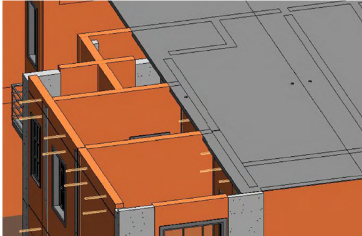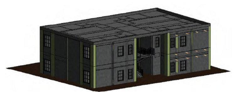 本工程為兩層剪力墻結(jié)構(gòu)住宅,共計(jì)4戶,二類建筑,采用65㎡標(biāo)準(zhǔn)化戶型模塊,建筑總面積570.16㎡,共兩層,采用裝配剪力墻結(jié)構(gòu)體系,目標(biāo)裝配率為78%,AA級裝配式建筑,工程全裝修。圖4為本工程的BIM三維圖。