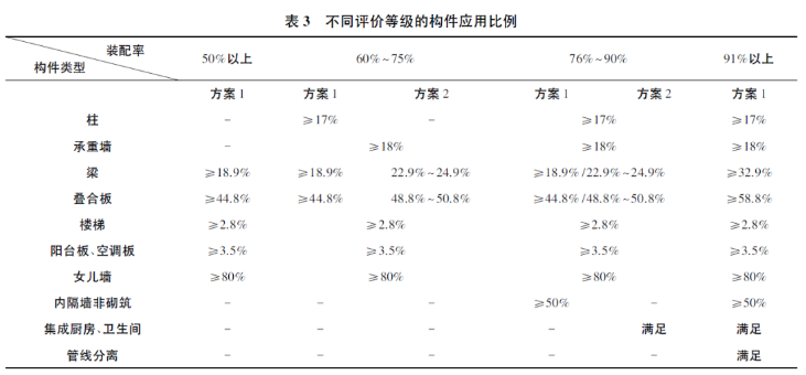此外,通過統(tǒng)計(jì)分析,得到不同評價等級對應(yīng)的構(gòu)件應(yīng)用比例(如表3) ,因預(yù)制構(gòu)件中梁、板對裝配率影響最大,所以裝配率的變化主要以調(diào)整梁、板應(yīng)用比例為主