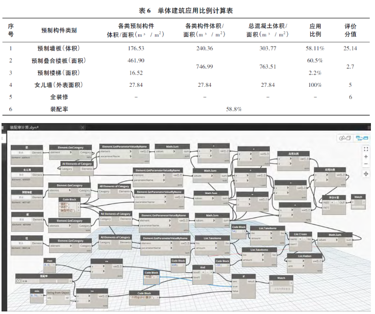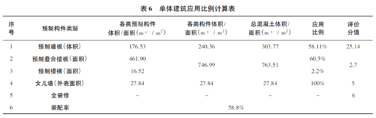 當(dāng)樓梯、內(nèi)墻、剪力墻、疊合板、女兒墻等構(gòu)件分別采用預(yù)制構(gòu)件的情況下,利用BIM通過計(jì)算規(guī)則計(jì)算預(yù)制部品部件的應(yīng)用比例,其應(yīng)用比例計(jì)算結(jié)果見表6。
