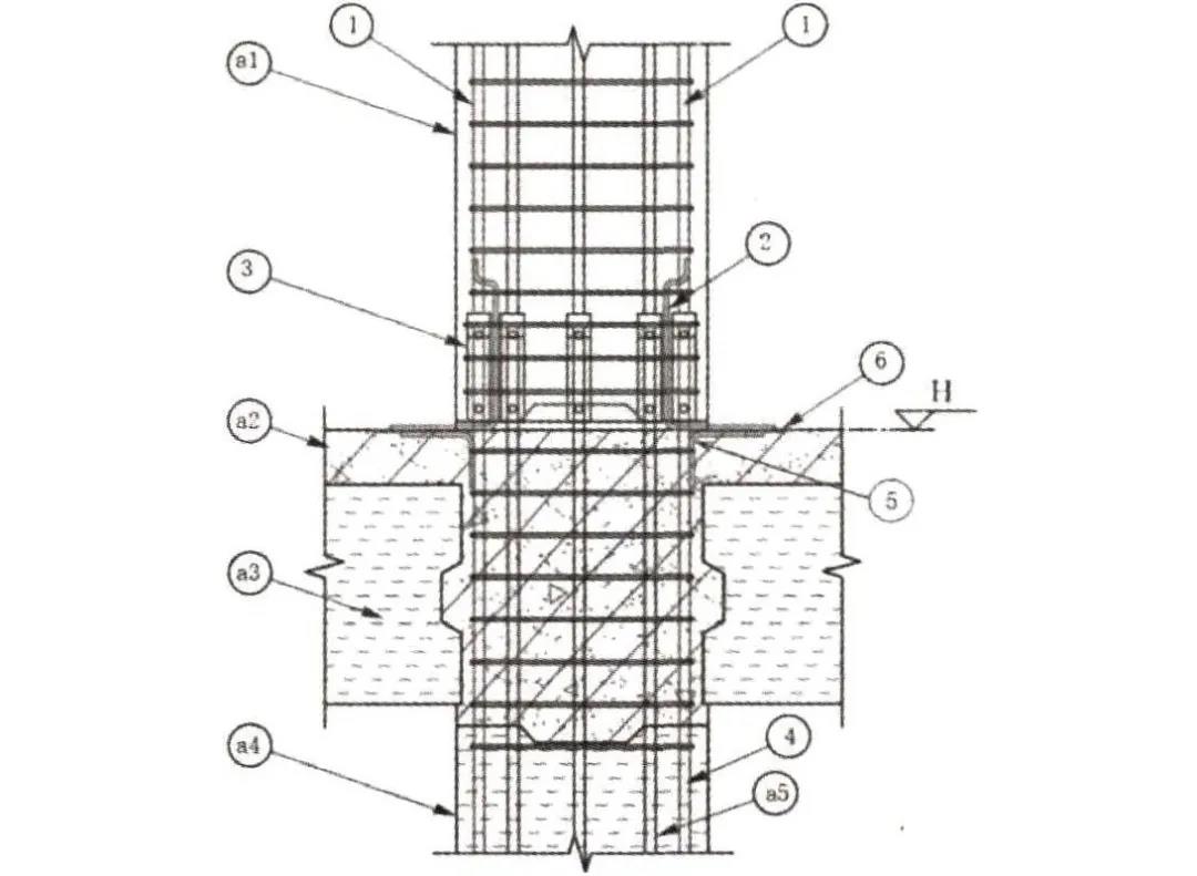 1.上部預(yù)制柱主筋;2.Ф10圓鋼;3.灌漿套筒;4.預(yù)埋接地連接板;5-40*4鍍鋅扁鋼;6.基礎(chǔ)地梁內(nèi)不小于Ф16兩根鋼筋;a3.預(yù)制柱內(nèi)主筋;a4.上部預(yù)制柱;a6.樁基承臺(tái);a7.結(jié)構(gòu)樁;a8.現(xiàn)澆柱