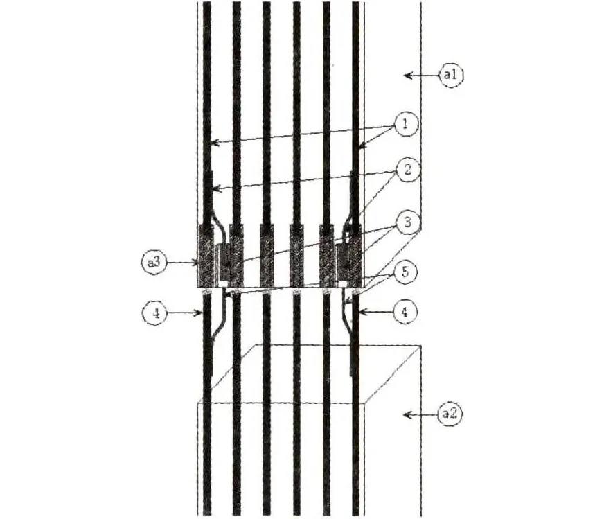 1.上部預(yù)制柱主筋;2,Ф10圓鋼;3.-40 X 4鍍鋅扁鋼;4.下部預(yù)制柱主筋;5.Ф10圓鋼;a1.上部預(yù)制柱;a2.下部預(yù)制柱;a3.灌漿套筒