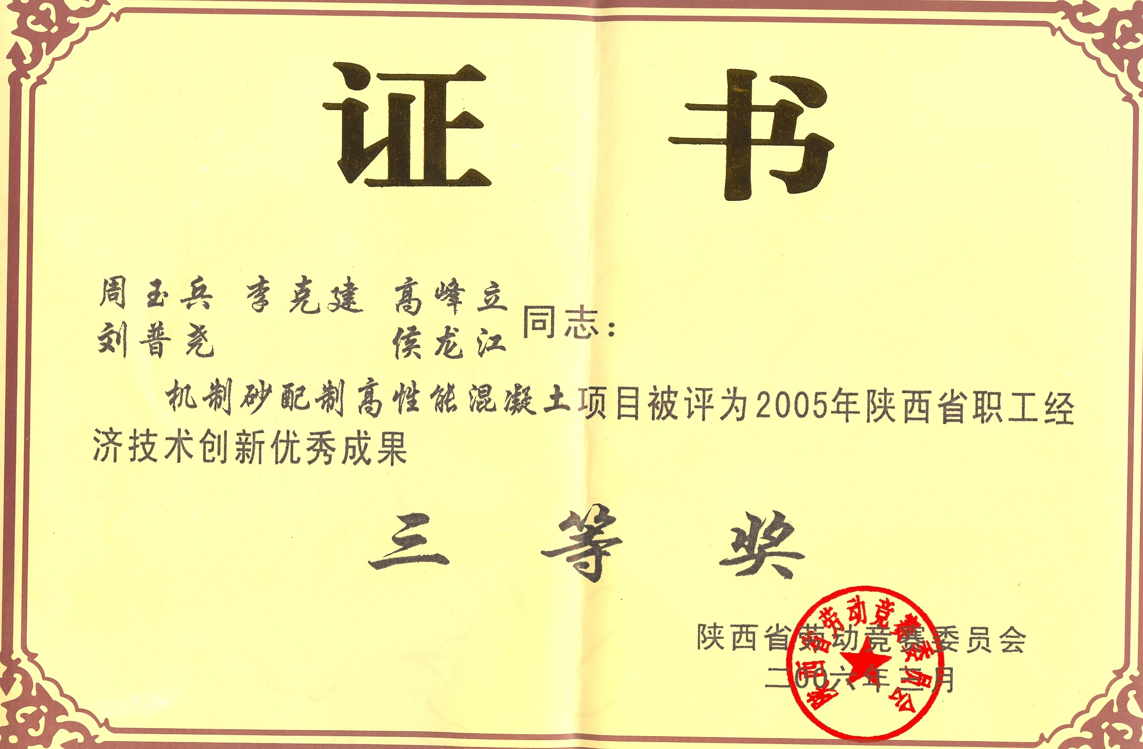 《機制砂配制高性能混凝土》獲陜西省職工經(jīng)濟技術創(chuàng)新優(yōu)秀成果三等獎